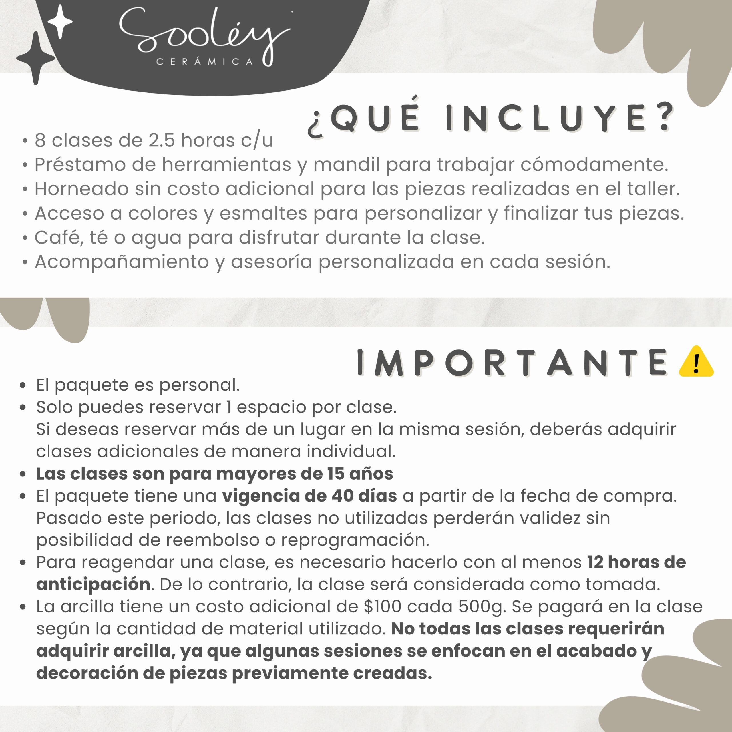 La arcilla tiene un costo extra de $100 por cada 500 g, que se pagará en la clase según la cantidad de material utilizada. Sin embargo, no todas las clases requerirán adquirir arcilla, ya que algunas sesiones pueden centrarse en el acabado y decoración de piezas previamente creadas.